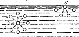 Сравним состояние молекулы жидкости, находящейся вблизи границы жидкости и воздуха, с состоянием молекулы, находящейся вдали от этой границы, внутри жидкости (рис. 1). Молекула внутри жидкости окружена другими молекулами со всех сторон (А). Молекулу же, находящуюся на границе с воздухом, молекулы жидкости окружают только с одной стороны (В), со стороны же воздуха молекул почти нет. Притяжение, испытываемое молекулой со стороны соседних, в случае «внутренних» молекул взаимно уравновешивается; для молекул, расположенных у поверхности, сложение всех сил дает равнодействующую, направленную внутрь жидкости.