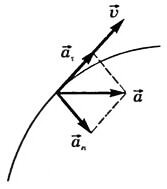 Вектор \(~\vec a\) при криволинейном движении можно разложить на две составляющие, направленные вдоль скорости \(~\vec a_{\tau}\) и перпендикулярно скорости \(~\vec a_n\) (рис. 1.7), \(~\vec a_{\tau}\) — тангенциальное ускорение, характеризующее быстроту изменения модуля скорости при криволинейном движении, \(~\vec a_n\) — нормальное ускорение, характеризующее быстроту изменения направления вектора скорости при криволинейном движении Модуль ускорения \(~a = \sqrt{a^2_{\tau} + a^2_n}\).
