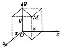 Координата x точки Μ — это проекция конца радиуса-вектора точки Μ на ось Ох. Обычно пользуются прямоугольной системой ко ординат. В этом случае положение точки Μ на линии, плоскости и в пространстве определяют соответственно одним (x), двумя (х, у) и тремя (х, у, z) числами — координатами (рис. 3).