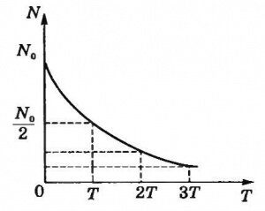 Если в начальный момент времени t0=0 было N0 радиоактивных ядер, то через промежуток времени, равный периоду полураспада t1=T, число нераспавшихся ядер \(N_1 = \frac{N_0}{2}.\) Спустя еще такой же промежуток времени t2=2T число нераспавшихся ядер \(N_2 = \frac{N_1}{2} = \frac{N_0}{4} = \frac{N_0}{2^2}.\)По истечении t = nT радиоактивных ядер останется \(N = \frac{N_0}{2^n}.\) Поскольку \(n = \frac{t}{T},\) то