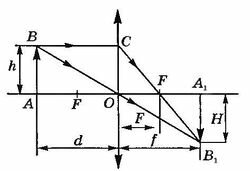 Из треугольников АВО и А1В1О \(\frac{A_1B_1}{AB}=\frac{A_1O}{AO}.\) Тогда \(\frac{H}{h}=\frac{f}{d}.\) Следовательно, увеличение линзы \(\Gamma=\frac{f}{d}.\)