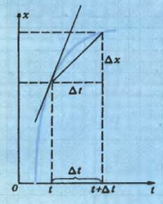 Интересна еще одна особенность параболы, позволяющая легко определять и скорость движения тела. Известно, что если график движения представляет собой прямую (прямолинейное равномерное движение), то скорость определяется углом наклона прямой к оси t. График же прямолинейного неравномерного движения — всегда кривая. Если выделить на этой кривой участок, соответствующий промежутку времени Δt и изменению координаты Δx (рис. 4), то отношение \(~\frac{\Delta x}{\Delta t}\) будет равно средней скорости за время Δt. Как видно из рисунка 4, она определяется углом наклона хорды, стягивающей выделенный участок кри вой (она равна тангенсу этого угла). Если беспредельно уменьшать промежуток времени Δt, устремляя его к нулю, то хорда перейдет в касательную к кривой в точке, соответствующей моменту времени t, а угол ее наклона определит уже мгновенную скорость в этот момент времени. Таким образом, чтобы найти по графику движения мгновенную скорость в какой-то момент времени, нужно провести касательную к графику в точке, соответствующей этому моменту, и найти тангенс угла ее наклона к оси t.