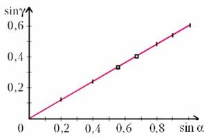 Получив данные при нескольких углах, постройте график зависимости угла преломления от угла падения (по Птолемею) и график зависимости синуса угла преломления от синуса угла падения (по Снеллиусу). Не забудьте отложить на этих графиках ошибки измерений. Не вдаваясь в теорию экспериментальных ошибок, будем считать, что значение угла может иметь максимальное и минимальное значения. Если, скажем, угол падения вы определяете по его тангенсу, то оцените, в каких пределах могут лежать длины катетов (цена деления прибора плюс ошибка процедуры фиксирования начала и конца измеряемого отрезка) соответствующего треугольника. Максимальное значение тангенса угла получается делением максимальной длины противолежащего катета на минимальное значение прилежащего катета. По таблицам или на калькуляторе находится соответствующее максимальное значение угла α. Аналогично рассчитывается и минимальное значение угла α.