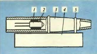 Для постановки многих опытов вам понадобится узкий пучок ИК лучей. Получить его можно с помощью диафрагмы. Например, так, как это показано на рисунке 3. Светодиод 1 отрезком 2 хлорвиниловой трубки или изолентой закрепляют на оси пластмассового колпачка 3 от старой шариковой ручки. Колпачок должен иметь длину примерно 60 мм, внутренний диаметр 5-6 мм и диаметр диафрагмирующего отверстия 1-2 мм. В качестве подставки 4 удобно использовать старательную резинку (ластик) размером примерно 10 × 20 × 50 мм. Колпачок крепится стальными дугами 5, которые легко сделать из канцелярских скрепок и вдавить в ластик.