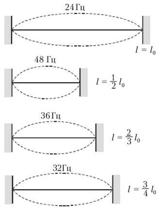 Из различных литературных источников следует, что первый физический эксперимент был осуществлен в школе пифагорейцев. Его суть понятна из рисунка 2, где изображены четыре струны одного диаметра, но разной длины, которые при одном и том же натяжении издают различные звуки. Еще лучше для изучения звучания струн разной длины использовать специальный прибор, называемый монохордом, в котором длина струны варьируется скользящим держателем, а одинаковость натяжения струн обеспечивается одной и той же пружиной. Скорее всего, именно так и был поставлен опыт Пифагором и его учениками (таким же образом этот опыт можно провести и сегодня в любом школьном кабинете физики).