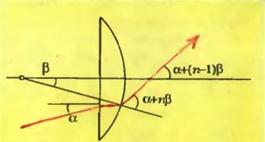 Изобразим линзу и построим ход одного из падающих лучей (рис.1; здесь линза выглядит толстой, а углы большими — это нужно только для наглядности, иначе ничего нельзя было бы разобрать). Выбранный нами луч падает на линзу под углом α к главной оптической оси, после преломления на плоской поверхности угол уменьшится в n раз, где n — показатель преломления стекла. На сферическую границу стекло—воздух луч надает под углом \(~\frac{\alpha}{n} + \beta\) , где β — угол между главной оптической осью линзы и радиусом, проведенном в точку падения луча, а выходит под углом
