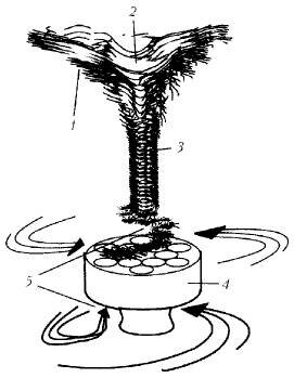 А теперь — самое главное. Что мы предложим людям? По нашему разумению, естественно предложить построить на пути торнадо рядом с поселениями сооружения типа решетки на опоре (рис. 14). Решетка (4) в виде перфорированного цилиндрическими каналами основного цилиндра — это лишь вариант того тела, которое будет изменять направление воздушных потоков (5), завихрять их и уже потом возвращать их основному вихревому потоку. Далее, понятно, сам торнадо (1, 2, 3) либо борется с собой до той поры, пока не иссякнет его энергия, либо он переместится подальше от людских поселений и угодий.