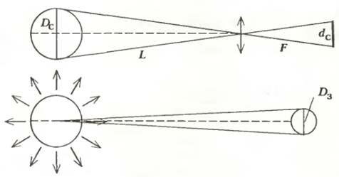 Закон Стефана — Больцмана очень полезный закон. Например, с его помощью можно оценить температуру «поверхности» Солнца, даже не погружая в него термометр. Надо лишь знать среднюю температуру Земли Tz и определить угловой диаметр диска Солнца αc, что легко сделать при помощи положительной линзы (рис.1). Измерив Dc и F (фокусное расстояние), получим αc ≈ Dc / F ≈ 0,5 градуса ≈ 10-2 радиана. Теперь запишем тот факт, что Земля заметно не нагревается и не охлаждается, по крайней мере в течение нашей жизни (имеется в виду средняя по поверхности температура Tz ≈ 300 К). Значит, тепло Солнца, поглощенное Землей, переизлучается ею же в космос. Если искомая температура Солнца Tc, то в единицу времени вся его поверхность излучает во всех направлениях энергию \(~\sigma T^4_c \pi D^2_c\). Земля получает только часть этой энергии, равную отношению ее диаметрального сечения \(~\frac{\pi D^2_z}{4}\) к площади \(~4 \pi L^2\) сферы с радиусом L, равным расстоянию между Землей и Солнцем. Вся эта энергия тут же излучается поверхностью Земли (хотя она и не раскалена и не светится) при ее температуре Tz. Итак,