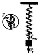 Рассмотрим, например, тело, подвешенное к пружине, другой конец которой закреплен (рис. 2). На тело действует сила тяжести \(~\vec F_T = m \vec g\) направленная вниз. Оно поэтому начинает падать, увлекая за собой нижний конец пружины. Пружина окажется из-за этого деформированной, и появится сила упругости \(~\vec F_{ynp}\) пружины. Она приложена к верхнему краю тела и направлена вверх. Верхний край тела будет поэтому «отставать» в своем падении от других его частей, к которым сила упругости пружины не приложена. Вследствие этого и тело деформируется. Возникает еще одна сила упругости – сила упругости деформированного тела. Она приложена к пружине и направлена вниз. Вот эта сила и есть вес тела.